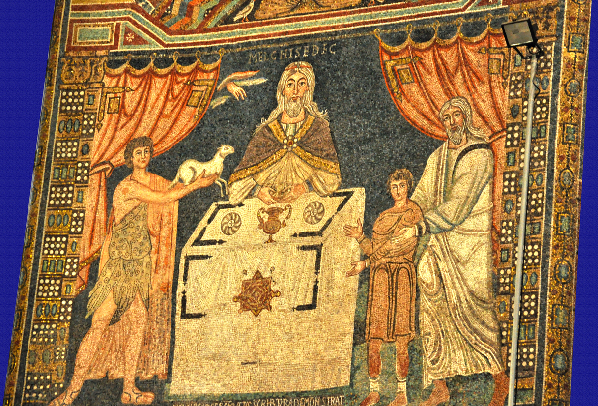 (Actually, I think the mosaic at the neighboring church in Ravenna, Sant’ Apollinare in Classe, is more interesting, with Melchizedek presiding and Abel, with his lamb, and Abraham with his son Isaac, as presenters of the gifts.)